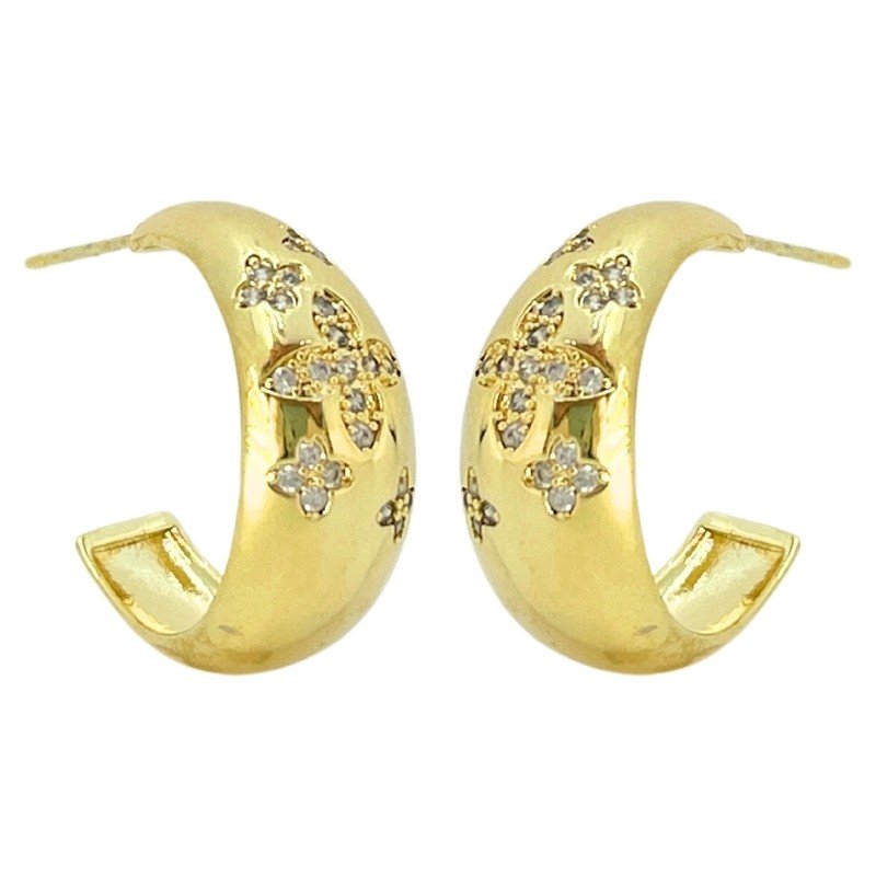 Brinco meia argola com visual imponente e acabamento sofisticado. As aplicações de pequenos trevos com zircônias trazem um charme especial, ideal para produções elegantes e com significado.