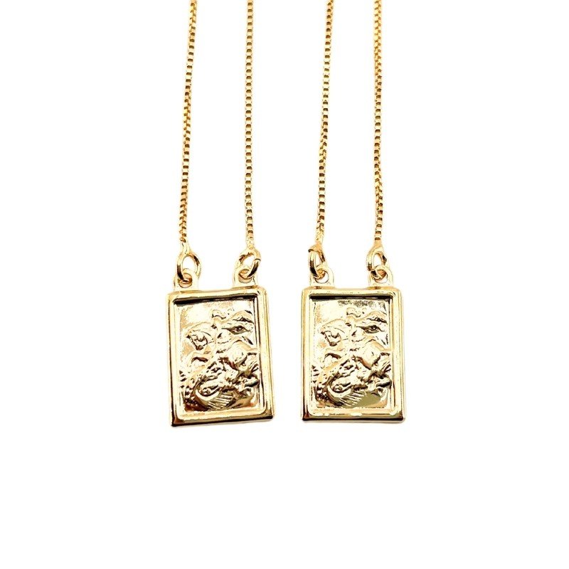 Esse escapulário celebra a força e a proteção de São Jorge, trazendo duas medalhas retangulares com imagem em alto relevo do santo guerreiro. Um acessório que une fé e estilo em uma proposta clássica e impactante.