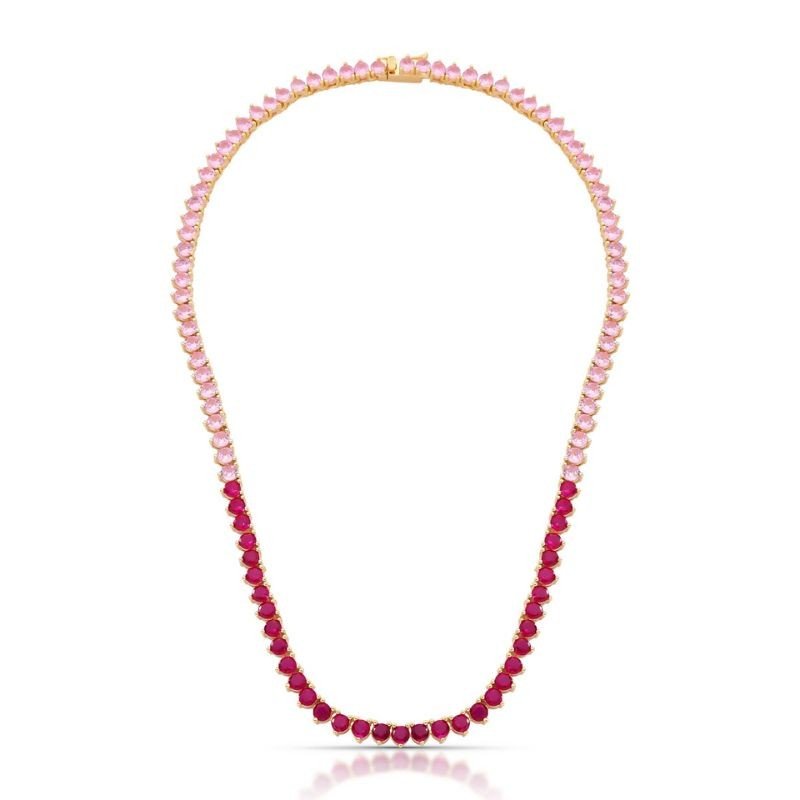 Uma explosão de charme e elegância: essa gargantilha riviera de 45cm com zircônias em tons de rosa e vermelho folheada a ouro traz um degradê moderno e sofisticado que transforma qualquer produç ...