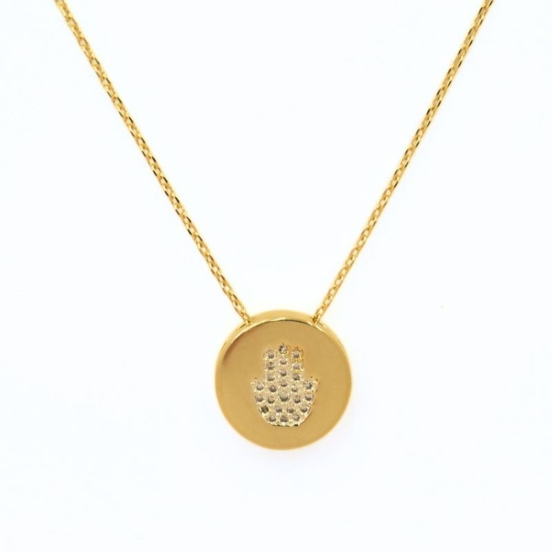 Para compor produções elegantes com um toque de proteção e significado, essa gargantilha de 45cm com pingente redondo e símbolo da Mão de Fátima cravejado é folheada a ouro e ideal para uso diário ou presentear com intenção.