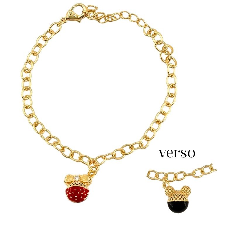 A pulseira dourada adulta Minnie é perfeita para quem ama acessórios divertidos com toque sofisticado. Seu pingente possui dupla face: de um lado, esmaltação vermelha com poás e laço; do outro, acabamento preto estilizado — duas opções em uma única peça.