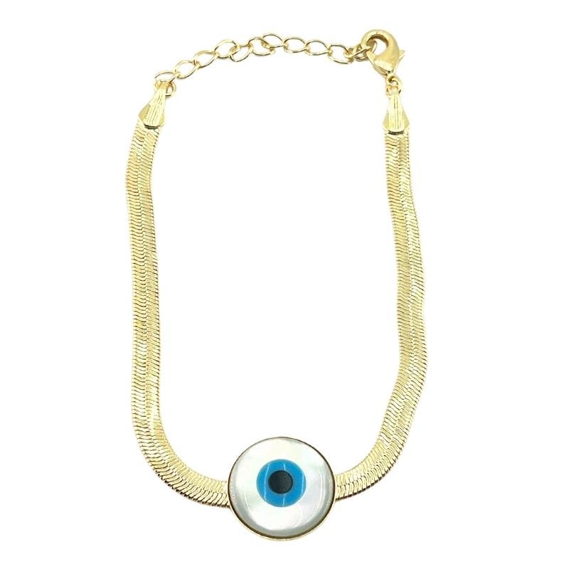 A pulseira fita dourada com olho grego é perfeita para quem busca um acessório moderno e cheio de significado. Seu design em fita brilhante garante um visual elegante, enquanto o pingente central de olho grego simboliza proteção e boas energias.